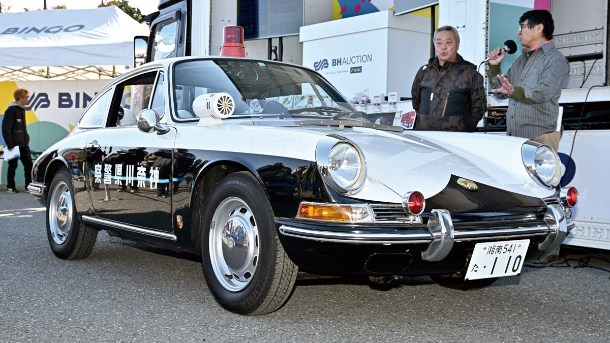 1960年代後半、東名高速道路の開通に合わせ、当時ポルシェの輸入元だったミツワ自動車が神奈川、静岡、愛知、京都の4県に1台ずつ寄贈しました。 現車はそのうちの唯一の生き残りです(神奈川県警に寄贈した912ベースのパトカー)。 高性能な4気筒エンジンを搭載し、警告灯とサイレンを備えながらも、ポルシェらしいスタイリッシュな外観を保ち、稀有な警察車両として注目を集めました。 ポルシェの性能と警察仕様のカスタマイズが見事に融合した、我が国の自動車史を飾る一片です。